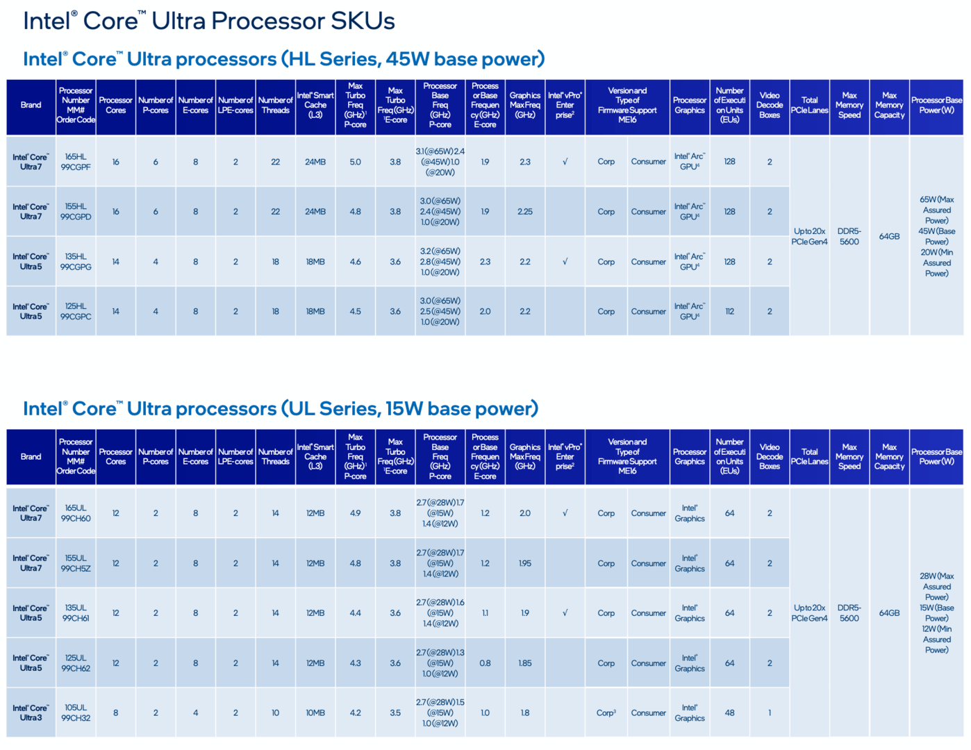 Топовые процессоры предлагают 16 ядер/22 потока (формула 6P+8E+2LP), 24 МБ кэш-памяти третьего уровня, встроенную графику Arc GPU на восемь Xe-ядер, 20 линий PCI Express 4.0, отдельный блок для ускорения ИИ-операций и работают с памятью DDR5-5600. Основные характеристики новинок собраны в таблицах.