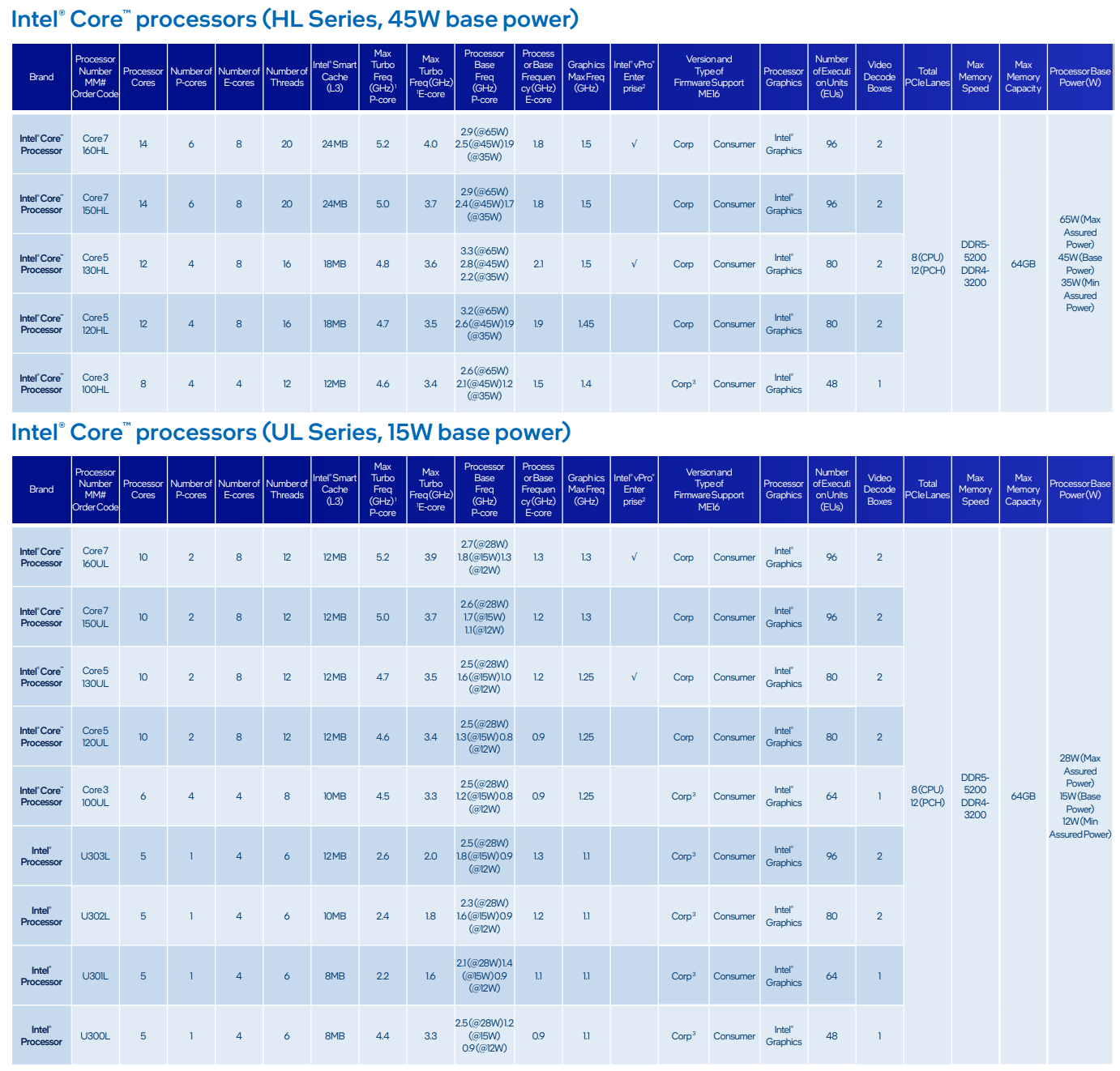 По техническим характеристикам процессоры Intel Meteor Lake-PS близки к мобильным чипам. Фактически главными отличиями новинок стало LGA-исполнение и гарантированная доступность в течение следующих десяти лет. Модельный ряд представлен HL- и UL-сериями Core Ultra 100, для которых характерен уровень Processor Base Power 20-65 Вт и 12-28 Вт соответственно.
