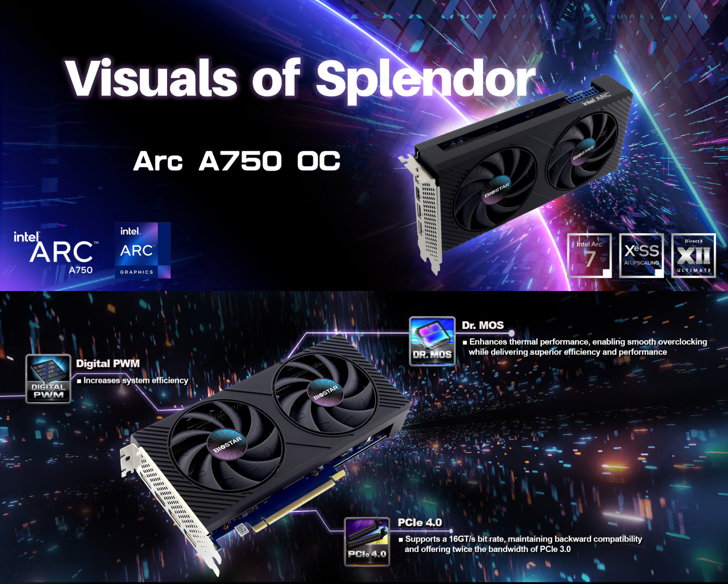 Графический процессор в составе видеокарты Biostar Arc A750 OC функционирует на частоте Graphics Clock 2200 МГц вместо эталонных 2050 МГц. Устройство использует 8 Гбайт памяти GDDR6 с 256-битной шиной и пропускной способностью 512 Гбайт/с. На торце у новинки распаяны два 8-контактных разъёма дополнительного питания, а набор видеовыходов представлен тремя DisplayPort 2.0 и одним HDMI 2.0. Паспортный уровень TBP составляет 225 Вт.