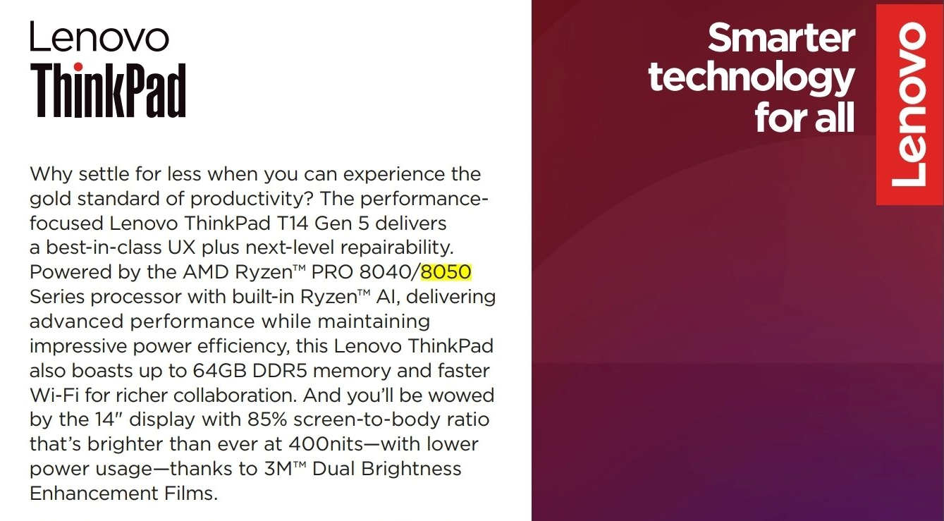 Lenovo тем временем раскрыла, что мобильные процессоры Strix Point сформируют линейку Ryzen 8050. Напомним, что в случае десктопных чипов Zen 5 (Granite Ridge) компания AMD решила перейти на маркировку Ryzen 9000. Что касается Lenovo, то она планирует использовать чипы Strix Point в ноутбуке ThinkPad T14 Gen 5.