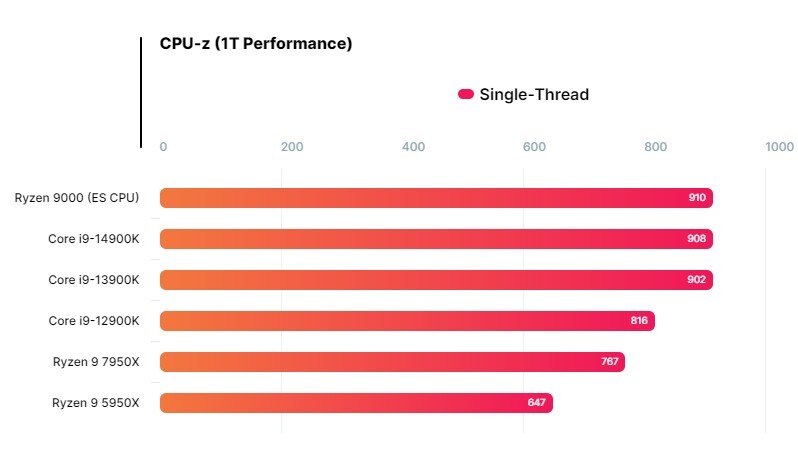 Образец процессора Ryzen 9000 с идентификатором 100-0000001290 и частотой до 5,8 ГГц был испытан во встроенном бенчмарке утилиты CPU-Z, где он показал весьма неплохой результат. Однопоточный тест новинка завершила с 910 баллами. Это примерно на 19% больше, чем набирает Ryzen 9 7950X с архитектурой Zen 4 и свидетельствует о хорошей прибавке быстродействия при переходе на Zen 5. Если сравнивать с аналогами Intel, то в бенчмарке CPU-Z новый Ryzen 9000 демонстрирует результат топовых чипов K-серии.