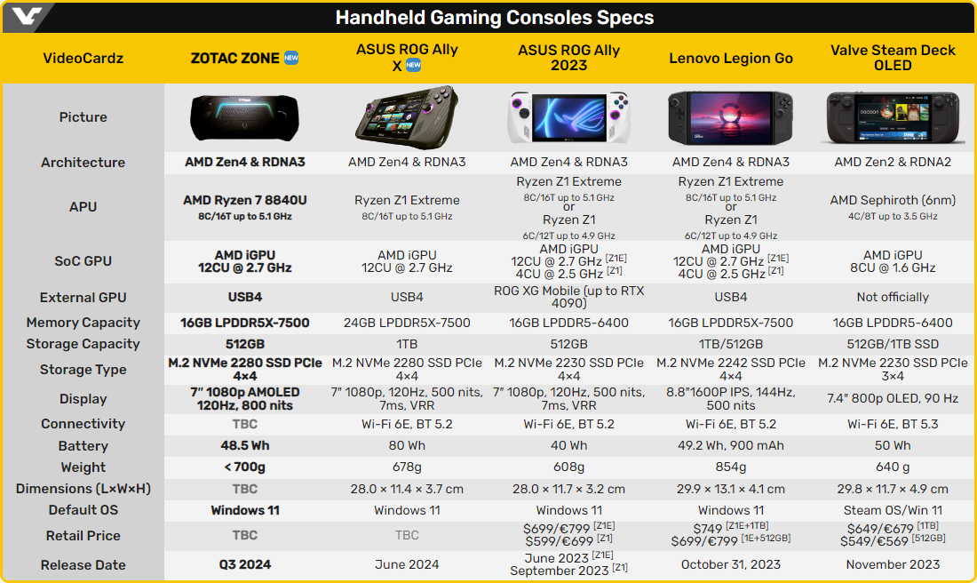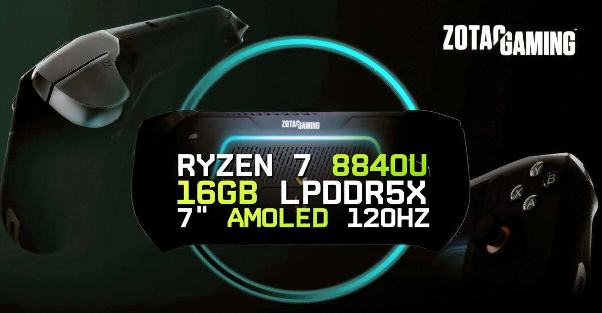 Зарубежные коллеги раздобыли спецификации портативной игровой системы Zotac Zone. Устройство базируется на платформе AMD Hawk Point, в частности одна из конфигураций будет использовать процессор Ryzen 7 8840U со встроенной графикой Radeon 780M. Новинка оснащена 7-дюймовым сенсорным AMOLED-дисплеем с разрешением 1080p, частотой обновления 120 Гц и максимальной яркостью 800 кд/м², 16 гигабайтами оперативной памяти LPDDR5X и твердотельным накопителем M.2 2280 вместимостью 512 Гбайт.