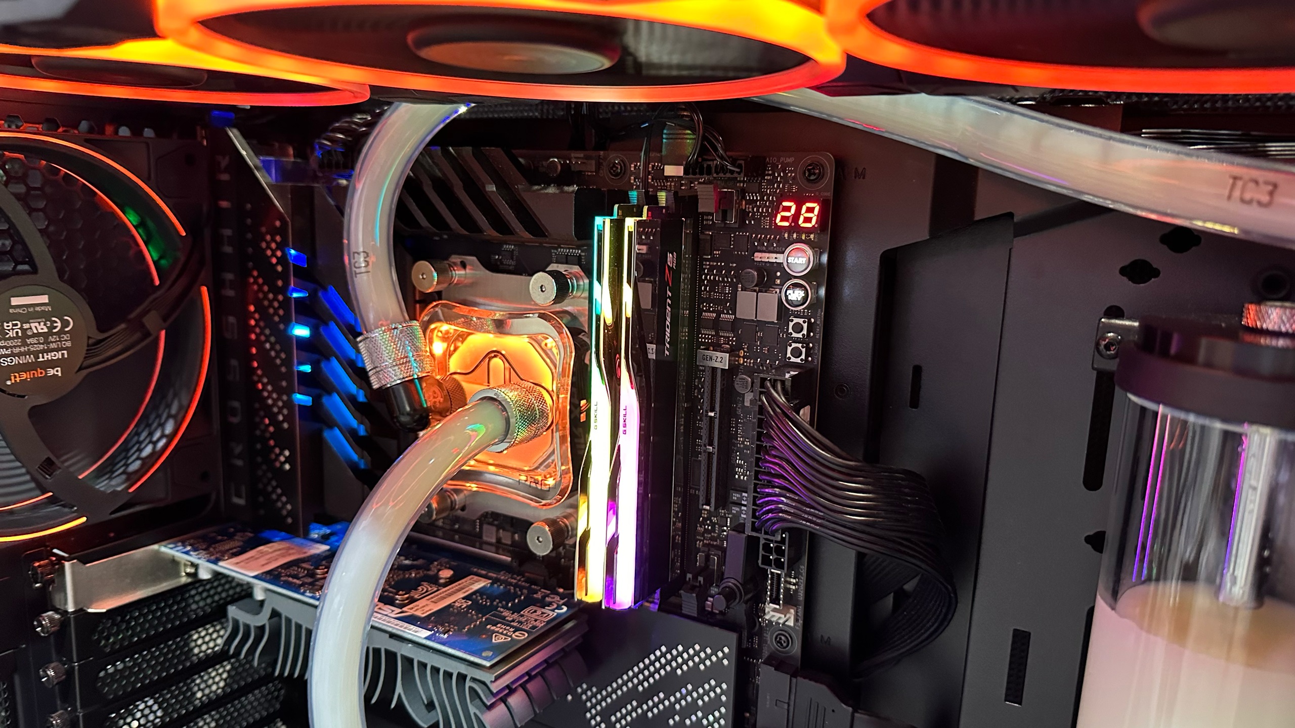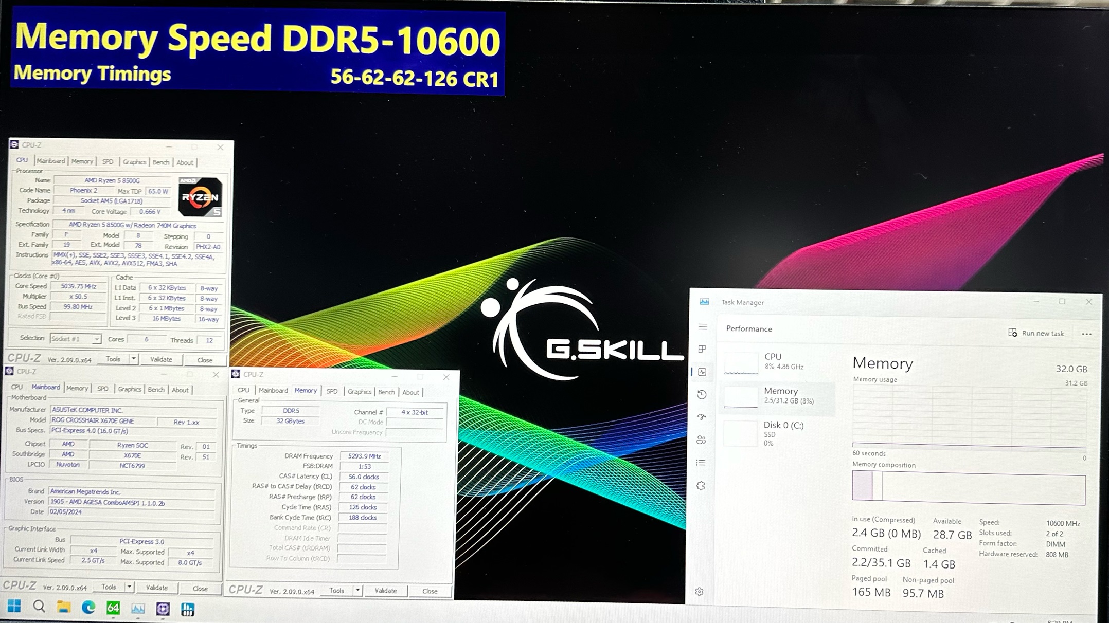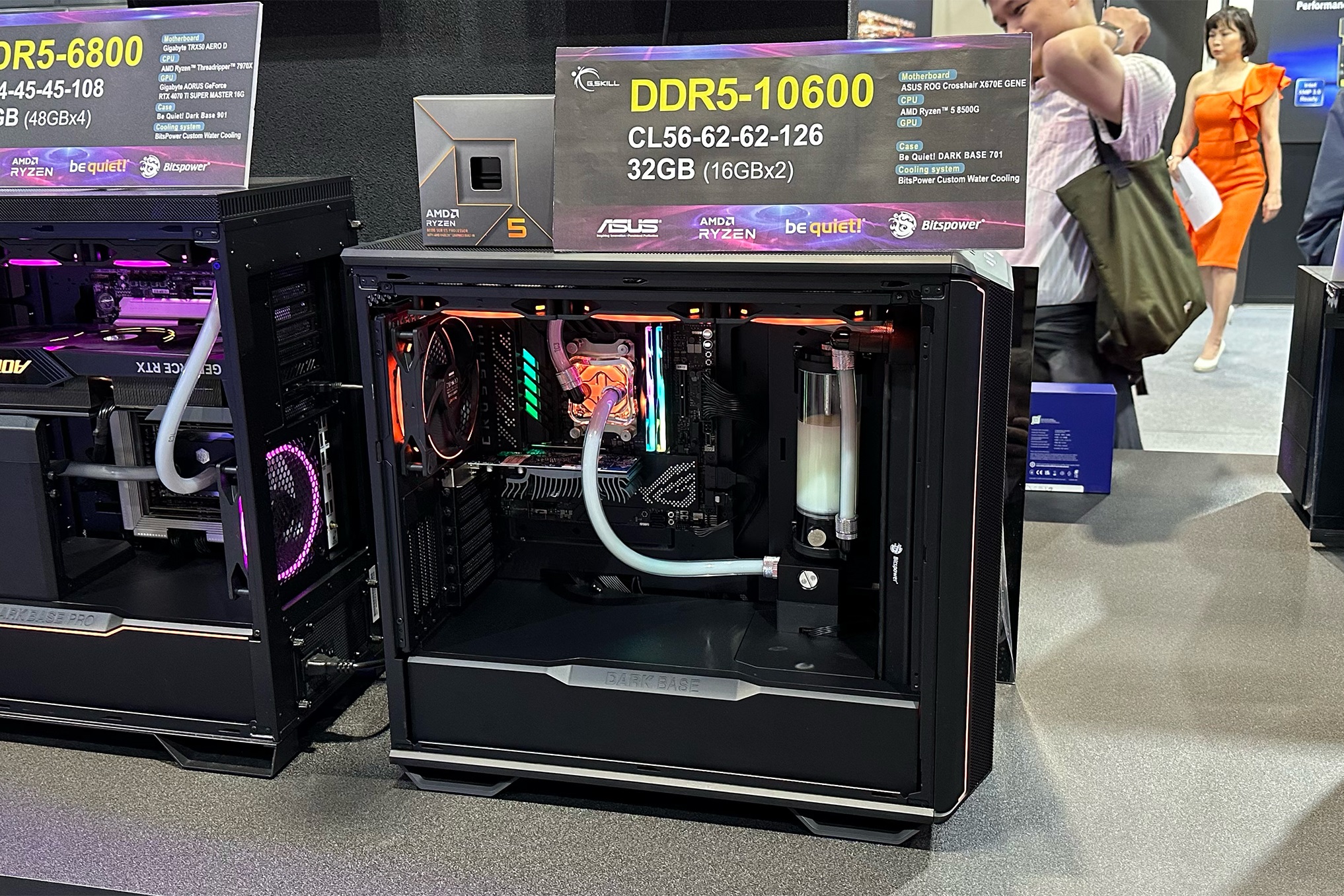 Вышеупомянутый комплект G.Skill Trident Z5 RGB был набран двумя 16-гигабайтными планками DDR5-10600. Для его демонстрации компания использовала компьютер на базе материнской платы ASUS ROG Crosshair X670E Gene и процессора Ryzen 5 8500G с жидкостным охлаждением. Формула задержек имела вид 56-62-62-126. Добавим, что производители модулей ОЗУ для демонстрации возможностей новых продуктов традиционно используют CPU Intel, но чипы AMD Ryzen 8000G справляются с этой задачей ничуть не хуже.