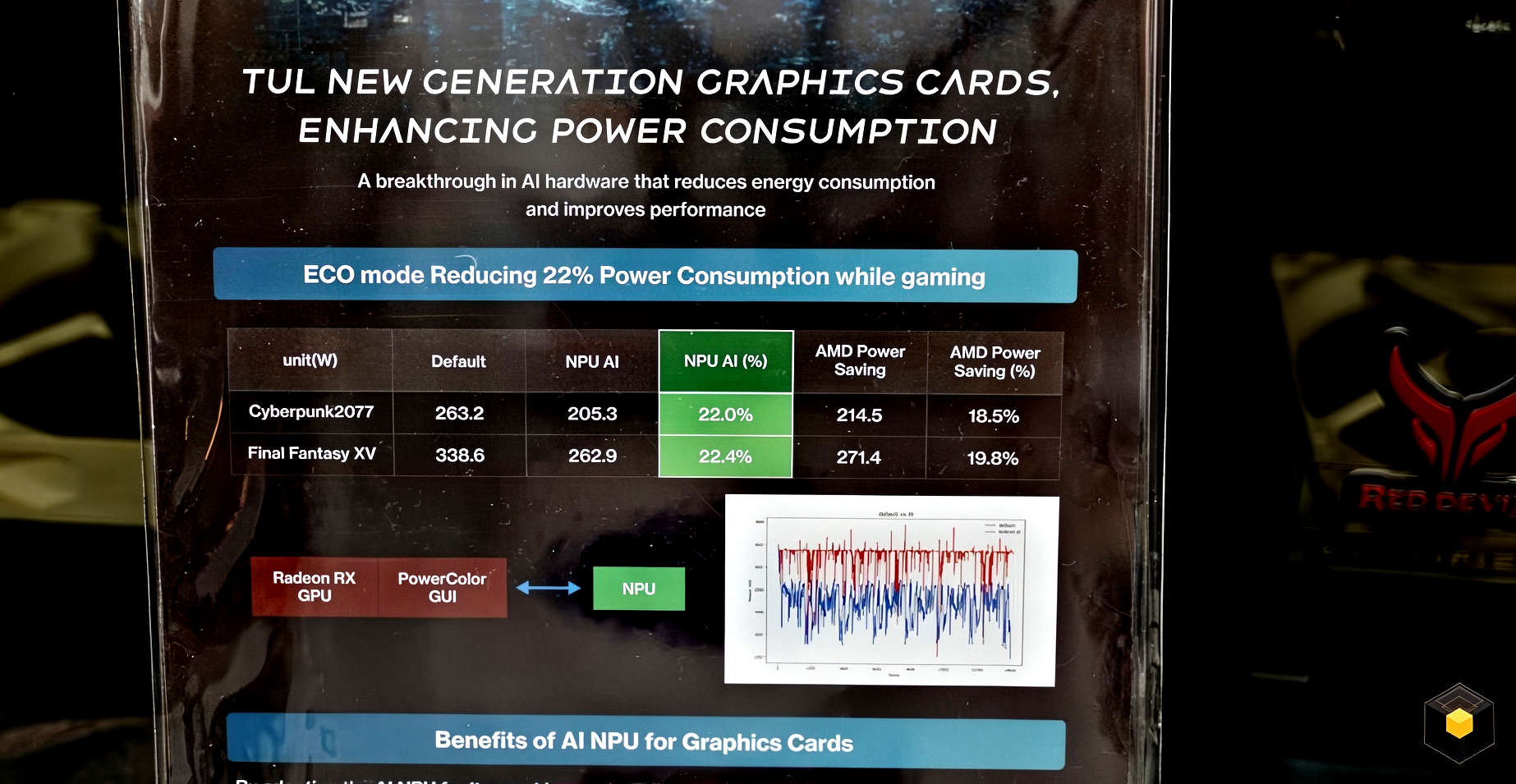 Микросхема NPU вместе с соответствующим программным обеспечением оптимизирует энергопотребление, «на лету» настраивая параметры видеокарты и скорость вентиляторов. Согласно тестам PowerColor, благодаря этому Radeon RX 7900 XTX в играх потребляет примерно на 22% меньше без существенной потери производительности. В это же время штатный энергосберегающий режим AMD позволяет достичь снижения «аппетитов» видеокарты на 18,5/19,8% (Cyberpunk 2077/Final Fantasy XV).