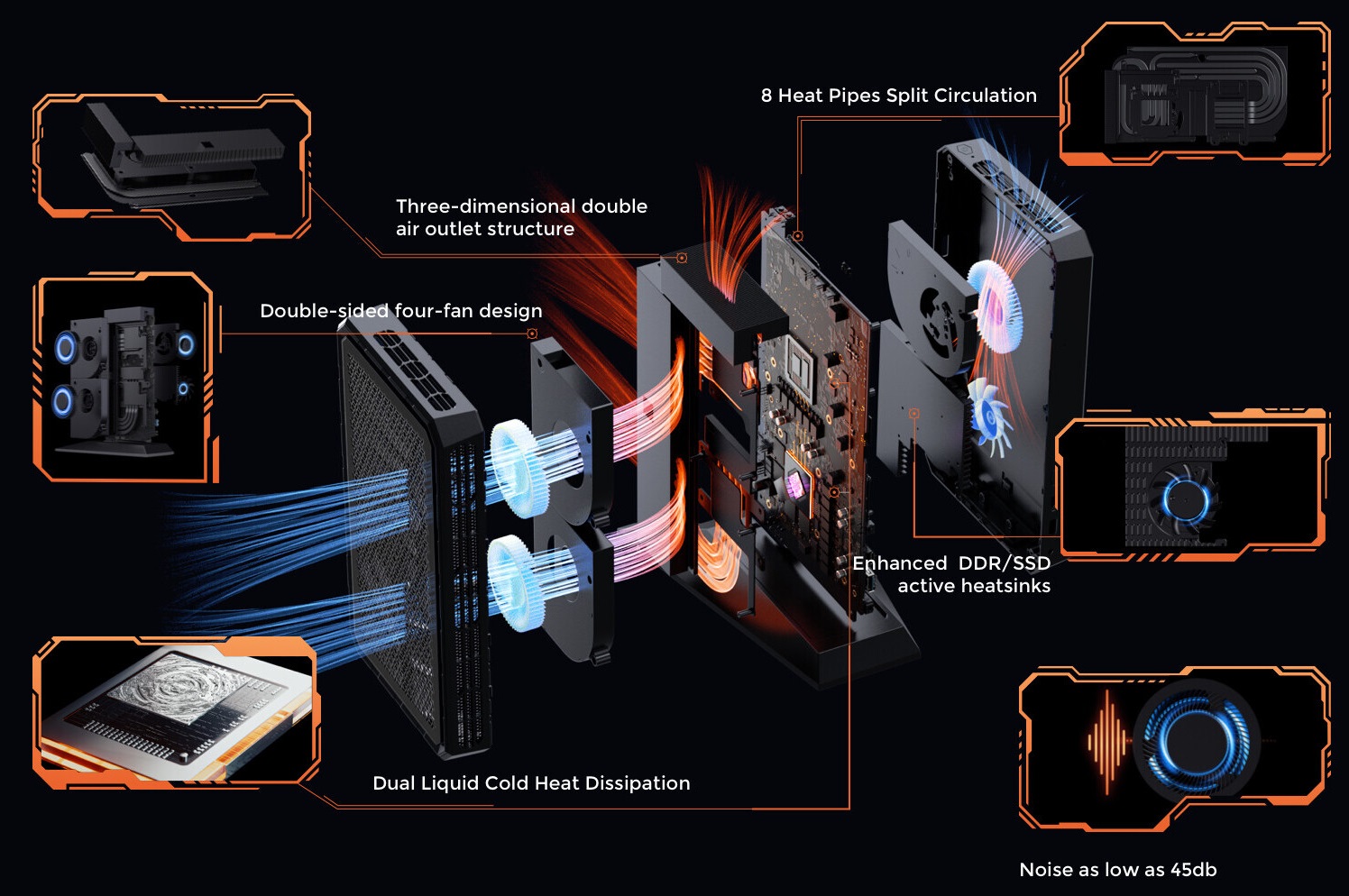 Ещё одной важной особенностью мини-компьютера стала мощная система охлаждения, способная рассеять до 205 Вт тепловой мощности. В ней использованы восемь тепловых трубок и четыре вентилятора, а на кристаллы CPU и GPU нанесёт жидкий металл. Из прочего стоит отметить 2,5-гигабитный Ethernet, беспроводной модуль Wi-Fi 7 и возможность подключения трёх 4K-мониторов, используя разъёмы HDMI 2.1, DisplayPort 2.0 и USB-C.