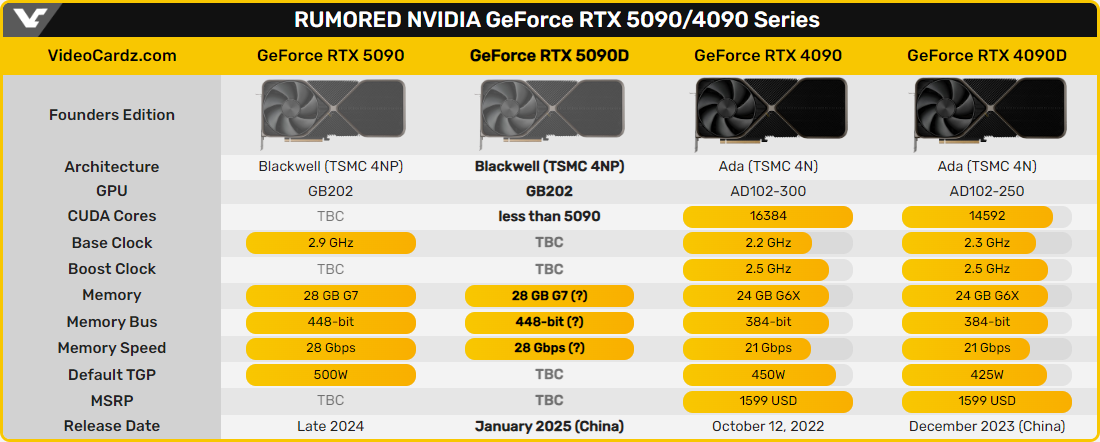 Относительно характеристик GeForce RTX 5090D на данный момент информации не поступало. Но зарубежные коллеги предполагают, что она сохранит конфигурацию видеобуфера (448-разрядная шина, 28 Гбайт GDDR7), но получит несколько урезанный графический процессор. К примеру, GeForce RTX 4090D предлагает на 11% меньше вычислительных блоков относительно обычной GeForce RTX 4090, но вместе с этим обладает тем же 24-гигабайтным буфером GDDR6X и меньшим уровнем TDP.