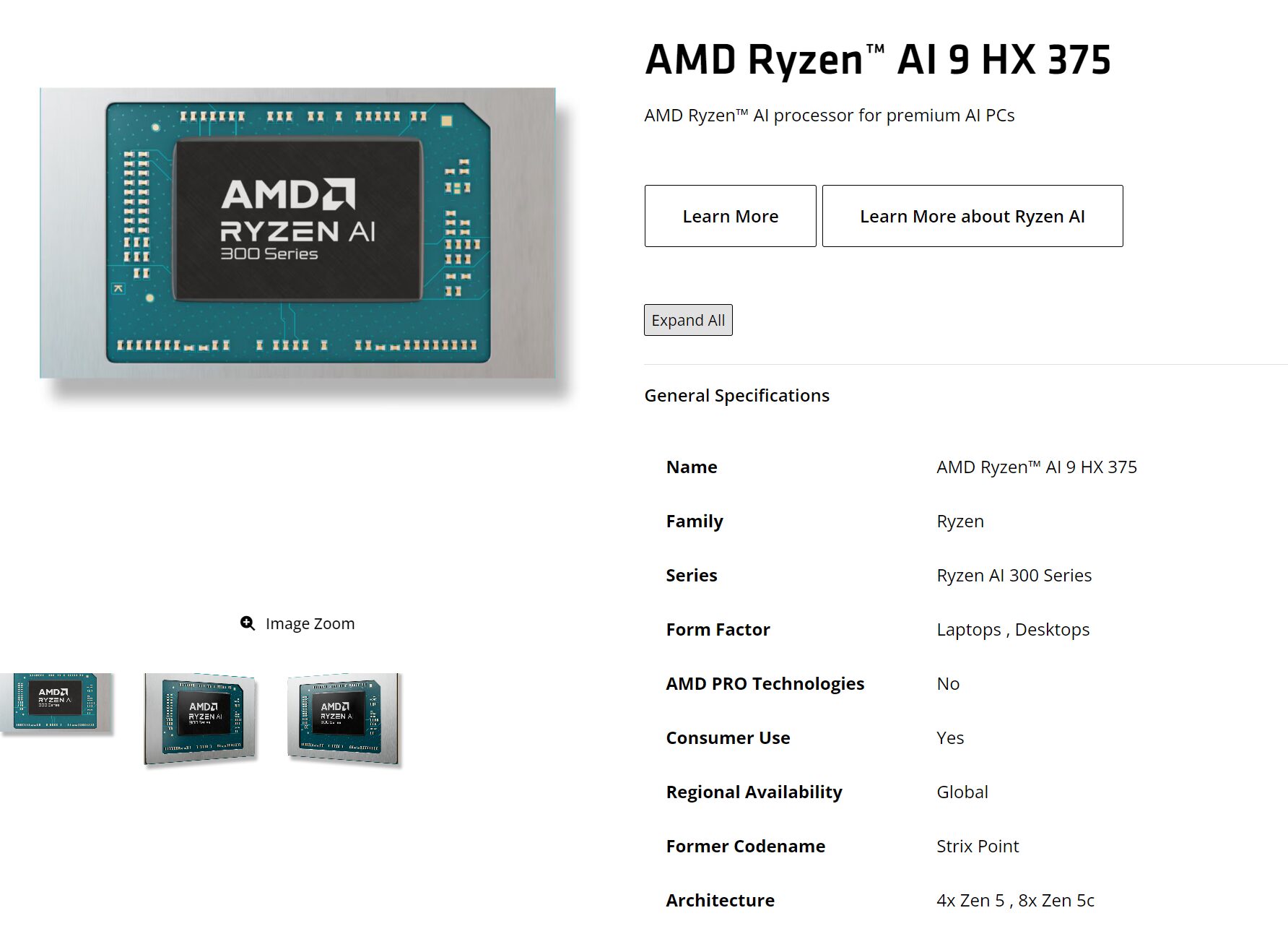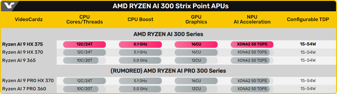 В преддверии официального релиза процессоров Ryzen AI 300 (Strix Point) компания AMD решила дополнить их модельный ряд. К анонсированным ранее Ryzen AI 9 HX 370 и Ryzen AI 9 365 примкнул чип Ryzen AI 9 HX 375, спецификации которого были опубликованы на официальном сайте AMD. Его особенность — увеличенная производительность NPU-блока, который отвечает за ускорение ИИ-приложений.