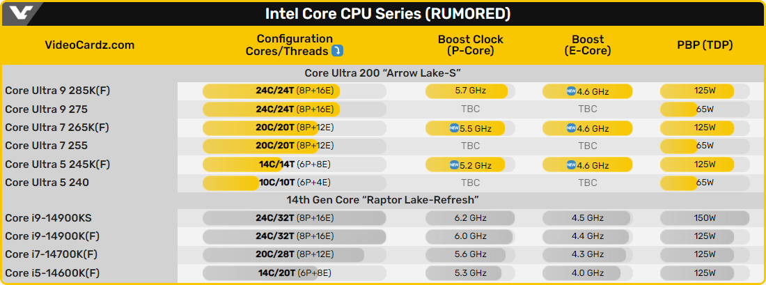 С каждым новым поколением настольных процессоров корпорация Intel традиционно увеличивает максимальную тактовую частоту. Будущие чипы Core Ultra 200 (Arrow Lake-S) станут исключением. Согласно последней информации, частота Turbo Boost для «больших» ядер у них будет ниже, чем у актуальных CPU Core 14-го поколения (Raptor Lake-S Refresh). С другой стороны, энергоэффективные ядра получат ощутимую прибавку.