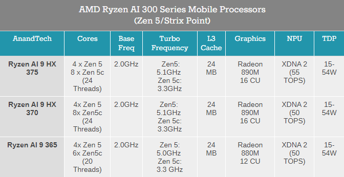 О главных особенностях мобильных чипов AMD Ryzen AI 300 мы рассказывали в материале по случаю анонса. Если кратко, то новые процессоры выпускаются по 4-нм технологии TSMC, содержат до 12 ядер (четыре Zen 5 и восемь Zen 5c), до 24 Мбайт кэш-памяти третьего уровня, встроенную графику поколения RDNA 3.5 (до 16 Compute Units) и NPU-блок производительностью 50-55 TOPS для ускорения ИИ-приложений. Уровень TDP может быть настроен в диапазоне от 15 до 54 Вт.