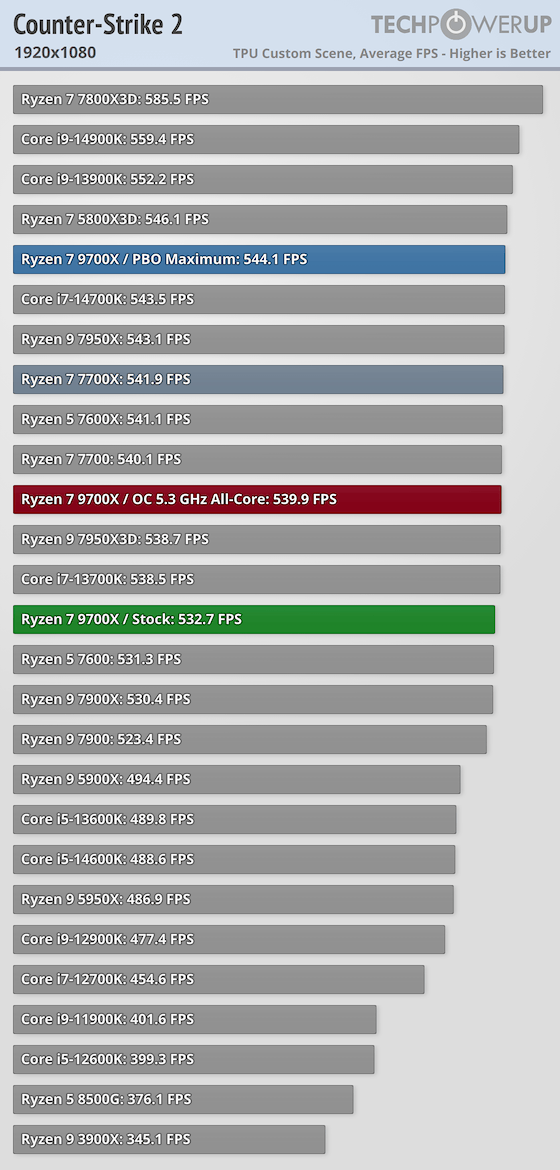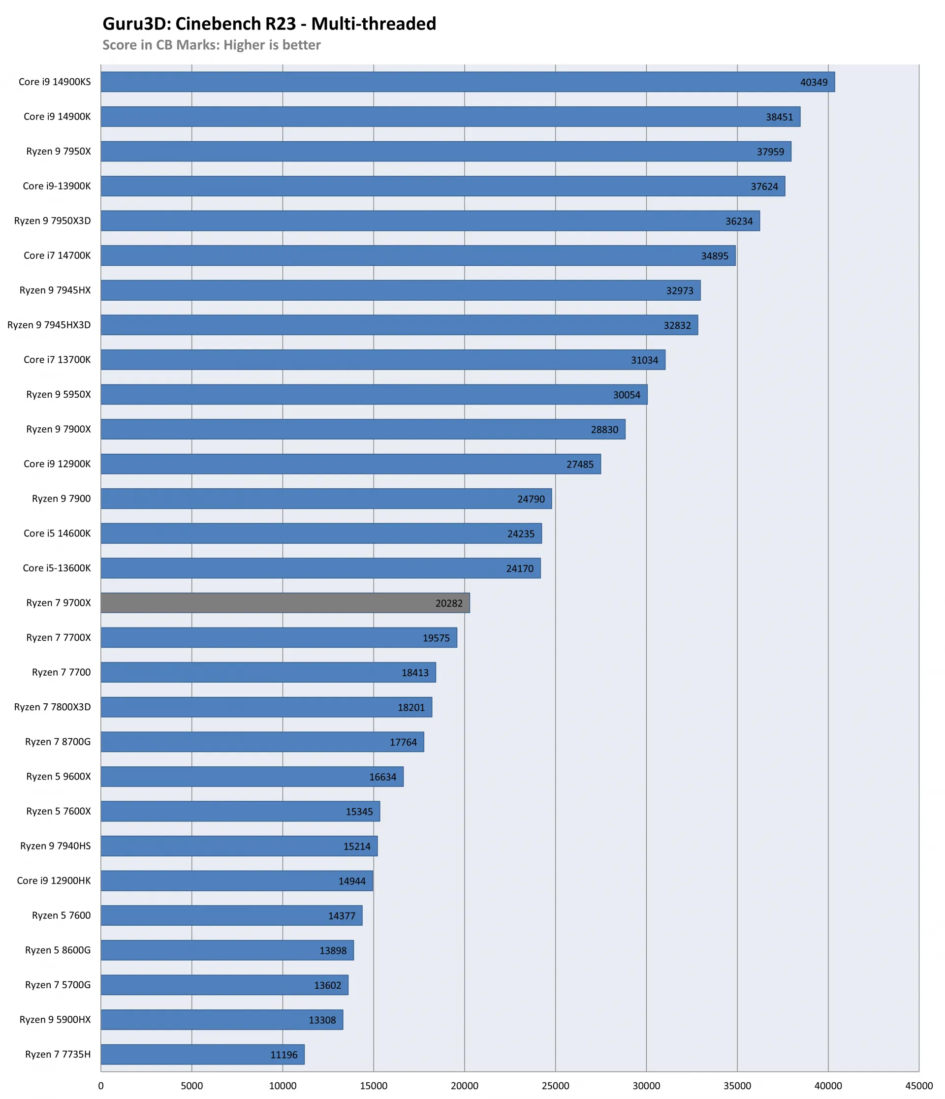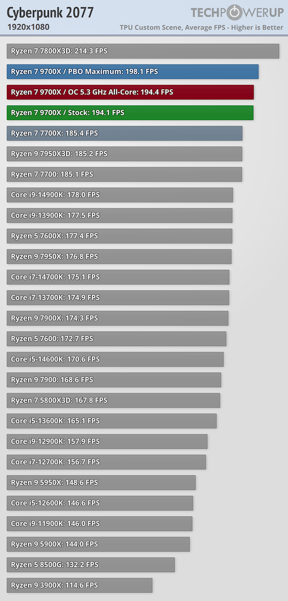 Для архитектуры Zen 5 компания AMD заявляла 16% прирост показателя IPC (числа выполняемых за такт инструкций) относительно Zen 4. Независимые тесты это в целом подтверждают. В большинстве бенчмарков новинки показывают ощутимый прирост производительности по сравнению с аналогами Ryzen 7000-й серии. С другой стороны, в играх преимущество остаётся за технологией 3D V-Cache, и многие геймеры при выборе между Ryzen 7 9700X и Ryzen 7 7800X3D отдадут предпочтение CPU Zen 4 с дополнительным L3-кэшем.