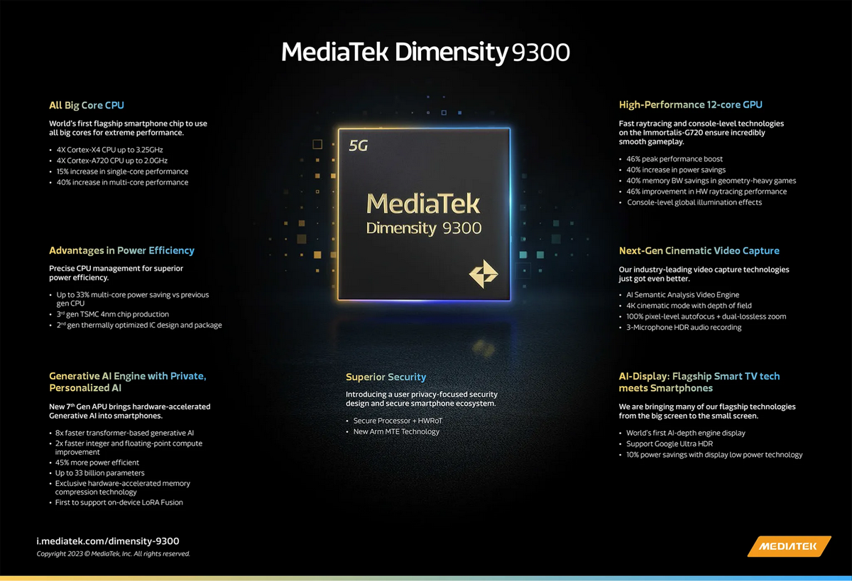 MediaTek Dimensity 9300 изготовлен по 4-нанометровому техпроцессу и имеет на борту: