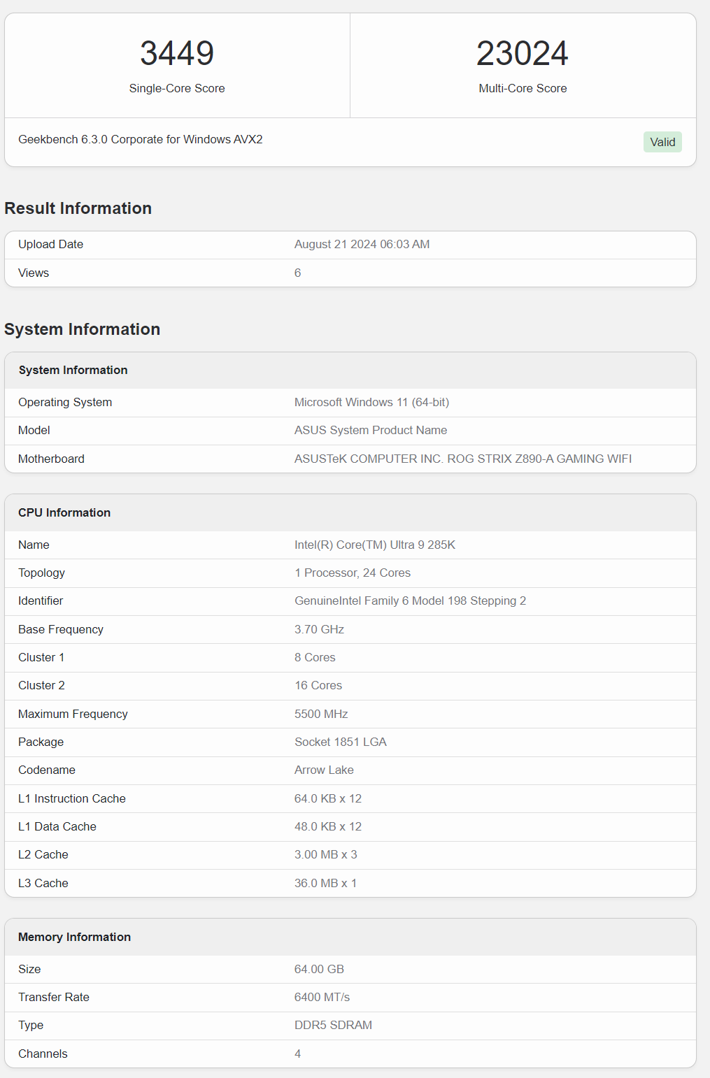 Официальный релиз процессоров Intel Core Ultra 200 (Arrow Lake-S) и настольной платформы LGA1851 уже не за горами. Будущий флагман — Core Ultra 9 285K — сегодня отметился в базе тестового пакета Geekbench. Новый процессор не только подтвердил основные параметры, но и продемонстрировал неплохой уровень производительности.