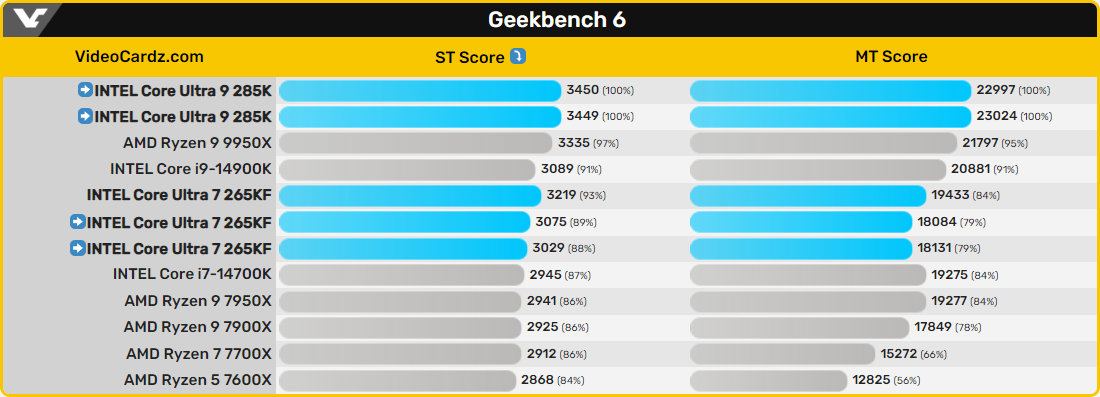 Geekbench 6 будущий настольный флагман Intel завершил с показателем около 3450/23000 баллов (Single-/Multi-Core). Это не только больше, чем набирает его предшественник в лице Core i9-14900K, но и лучше показателя выпущенного недавно процессора AMD Ryzen 9 9950X. В таблице ниже собраны результаты Core Ultra 9 285K, Core Ultra 7 265KF, а также ближайших соперников.