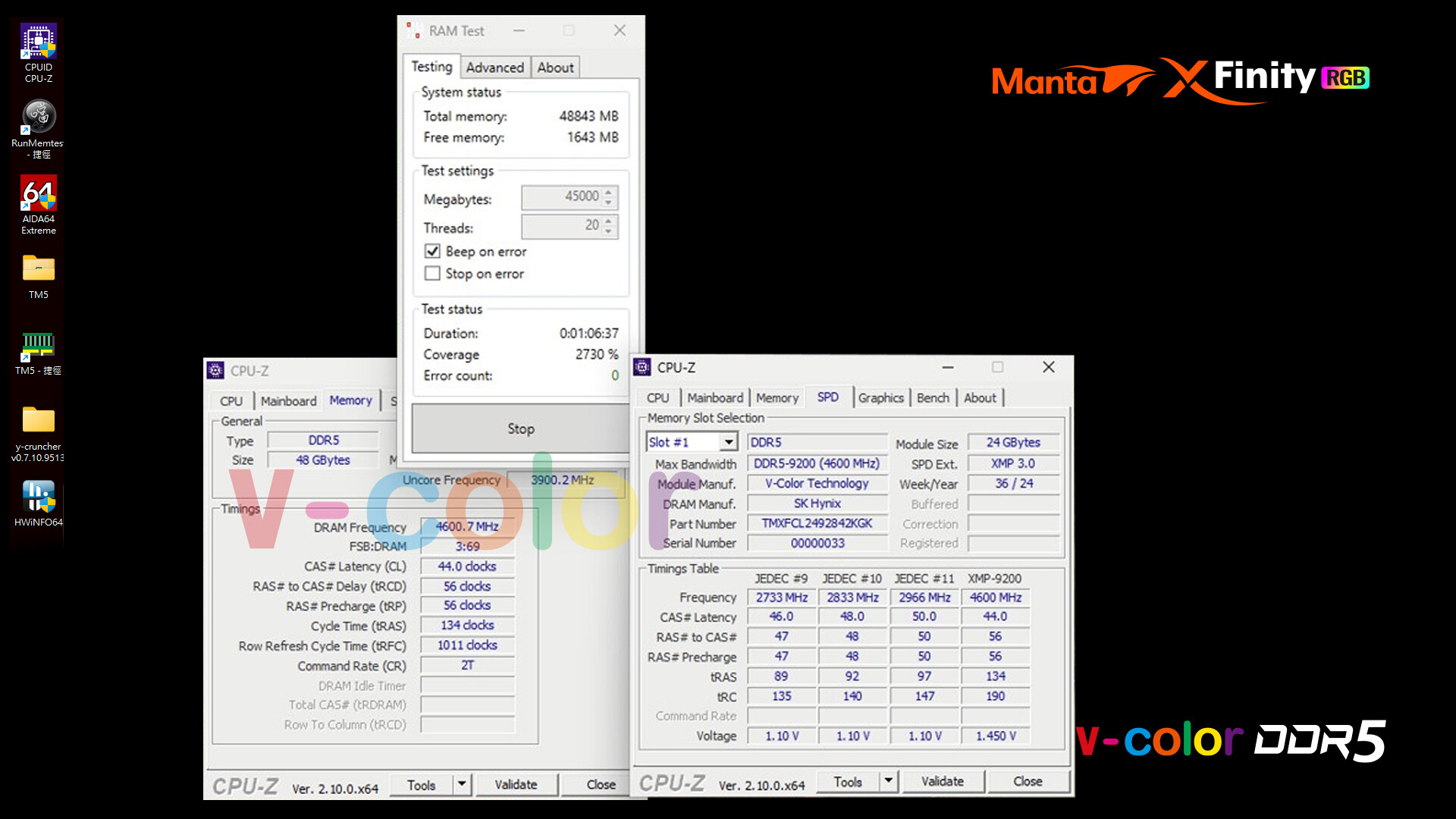 Для топового комплекта V-Color DDR5, как было сказано выше, характерен штатный режим работы DDR5-9200. В профиле Intel XMP 3.0 для него указана формула задержек 44-56-56-134 и напряжение 1,45 В. Среди прочих особенностей новинок вендор отмечает RGB-подсветку и оригинальный дизайн радиатора.