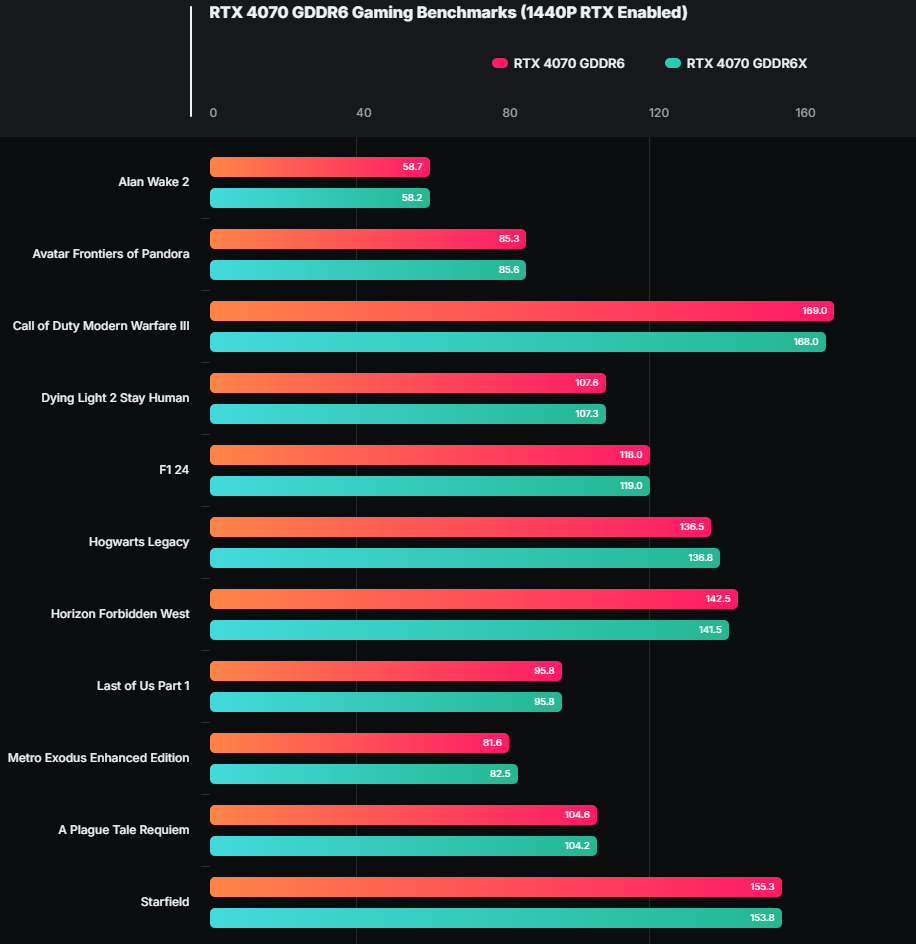 Как показал независимый обзор, производительность обновлённой GeForce RTX 4070 действительно осталась на старом уровне. Разница в частоте кадров между GDDR6- и GDDR6X-версиями составляла всего 1-2 fps, что можно списать на погрешность. Также зарубежные коллеги отмечают небольшое снижение температур и немного меньше энергопотребление видеокарты. Больше информации приведено по ссылке.
