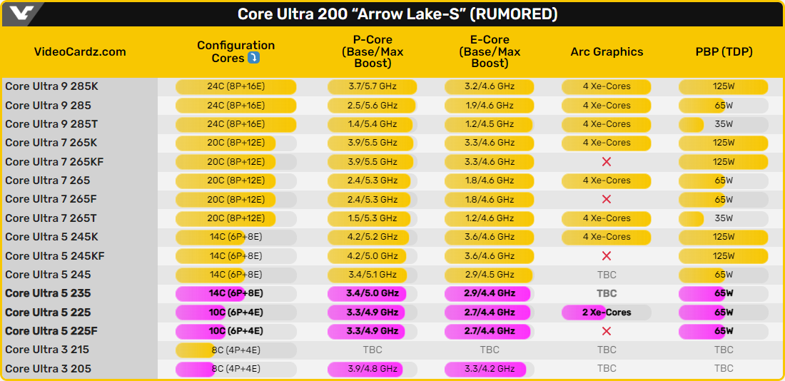 Спецификации настольных Intel Core Ultra 200. Источник VideoCardz