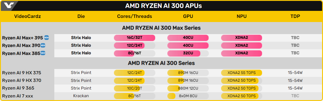 Согласно предоставленной информации, процессоры AMD Strix Halo сформируют линейку Ryzen AI Max 300. Её возглавит модель Ryzen AI Max+ 395, которая предложит 16 ядер Zen 5 и графический модуль на 40 Compute Units (CU) с архитектурой RDNA 3.5. Для сравнения, выпущенные летом APU Ryzen AI 300 предлагают до 16 блоков CU.