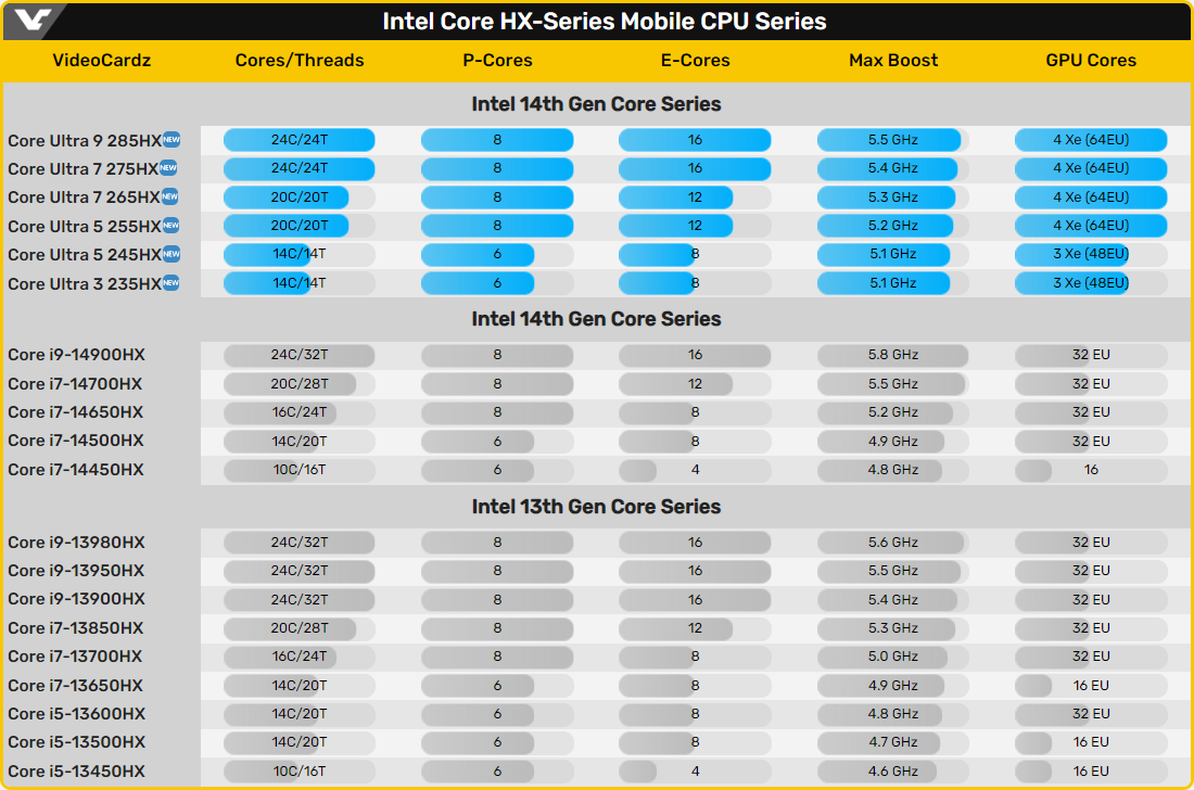 В Сеть попали характеристики линейки процессоров Intel Core Ultra 200HX, также известных как Arrow Lake-HX. Это CPU для игровых ноутбуков и мобильных рабочих станций, официальный релиз которых состоится в начале 2025 года.