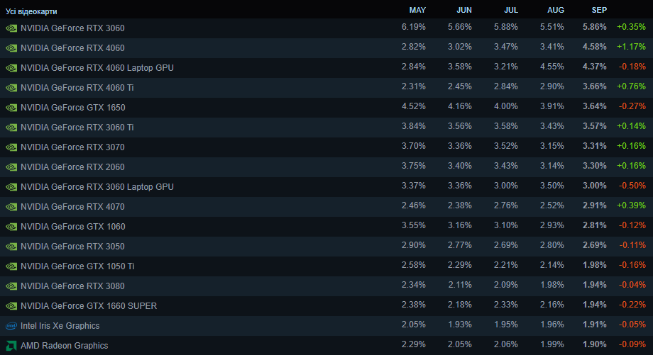 Valve опубликовала свежую статистику, которая рассказывает о предпочтениях пользователей Steam при выборе «железа» и операционных систем. По итогам сентября отмечается рост популярности видеокарт GeForce RTX 40-й серии, в первую очередь устройств класса GeForce RTX 4060 (Ti). Они пока не успели отобрать у GeForce RTX 3060 звание самой популярной видеокарты среди геймеров Steam, но уже наступают ей на пятки.