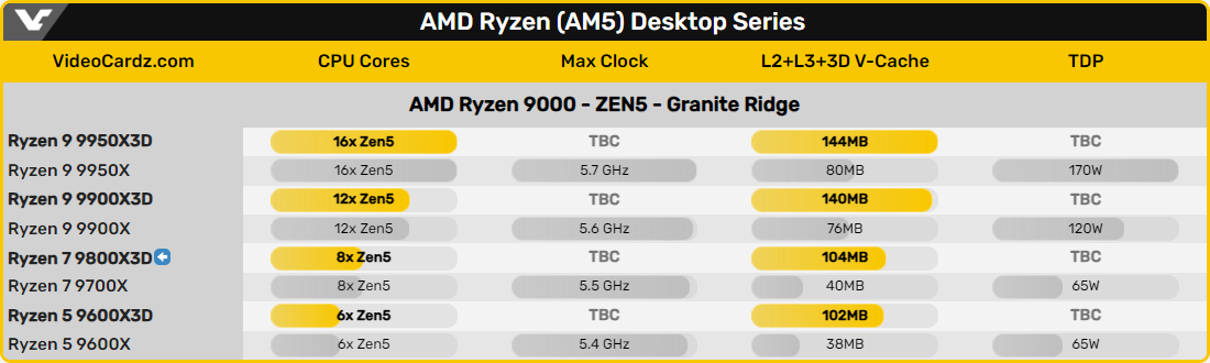Сообщается, что базовый показатель у AMD Ryzen 7 9800X3D составит 4,7 ГГц, а при многопоточной нагрузке все восемь ядер смогут работать на 5,2 ГГц. Обращаем внимание, что максимальная частота boost-режима окажется выше. Для сравнения, актуальный Ryzen 7 7800X3D функционирует на частоте от 4,2 ГГц и разгоняется в многопоточных задачах до 4,8 ГГц (при максимальном показателе boost до 5,0 ГГц).