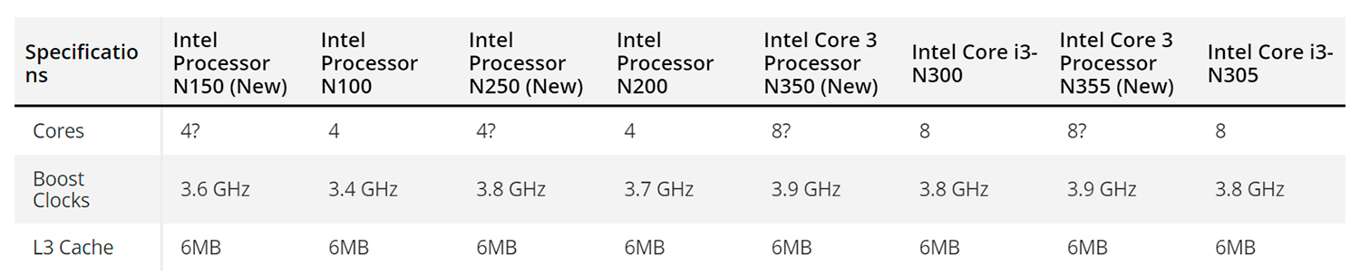 Новые процессоры будут основаны на старой архитектуре Alder Lake-N, как и прошлое поколение этих энергоэффективных CPU. Они сохранят такой же объем кэш-памяти, но немного вырастут рабочие частоты. Старший Intel Core 3 Processor N355 сохранит 8 ядер и кэш L3 6Мб, как у Intel Core i3-N300, но частота Boost вырастет с 3,8 ГГц до 3,9 ГГц. Аналогичные характеристики получит Intel Core 3 Processor N350. Младшие Intel Processor N150 и Intel Processor N250 получат 4 ядра при частоте до 3,6/3,8 ГГц.
