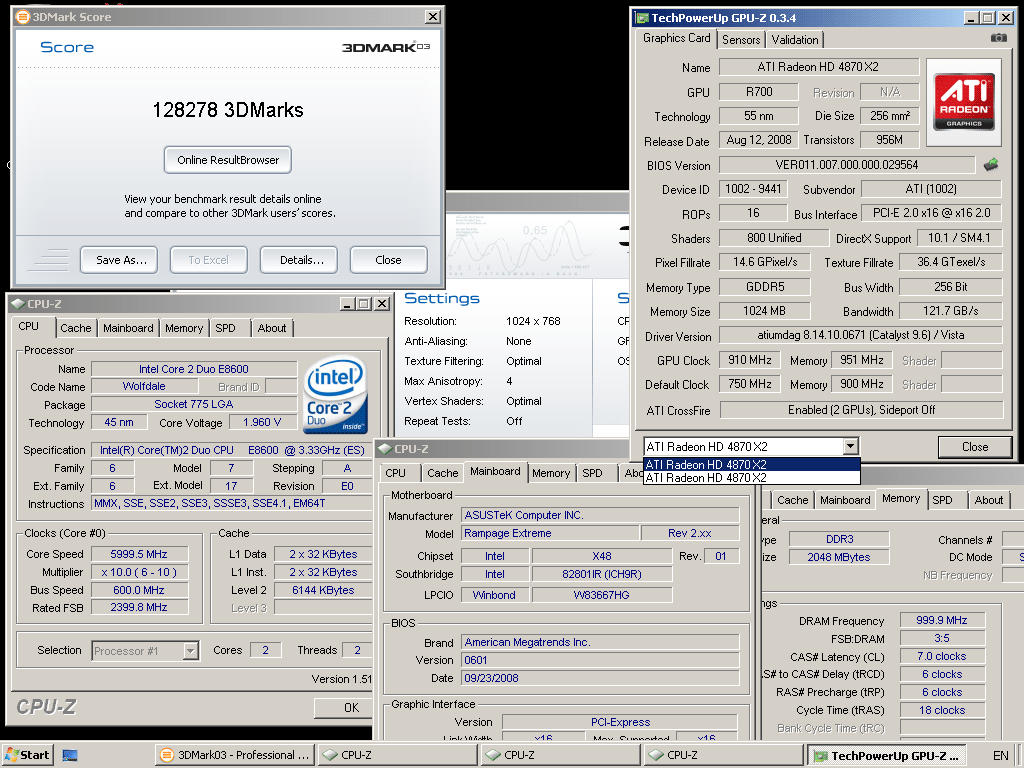 Для достижения столь солидного результата был собран стенд из материнской платы ASUS Rampage Extreme, процессора Core 2 Duo E8600, разогнанного до 6,0 ГГц, модуля памяти DDR3 на 2 ГБ и видеокарты Radeon HD 4870 X2 (910/3804 МГц). Подчеркнем тот факт, что графический адаптер охлаждался с помощью СВО, поэтому потенциал для завоевания первого места определенно имеется ;)