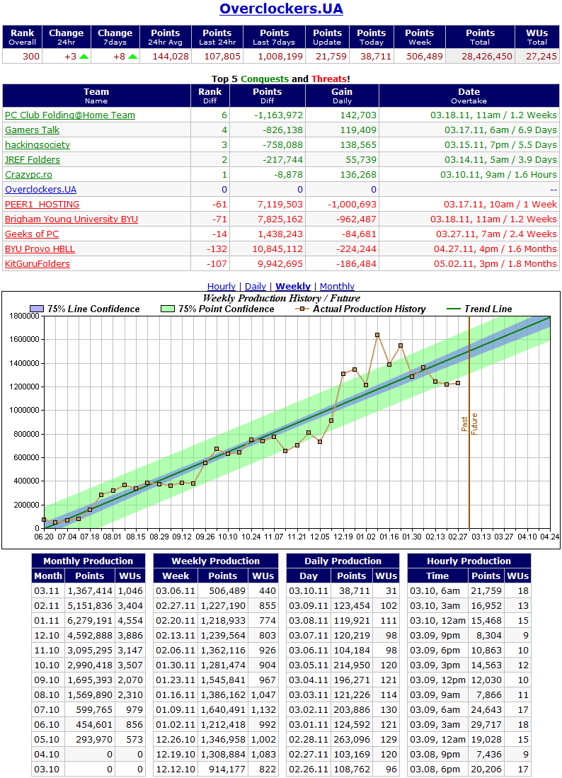 Производительность коллектива после кратковременного пика стабилизировалась на уровне 1,2 млн. баллов в неделю. Согласно статистике, при таком темпе вход в Топ-200 ожидается к 2012 году.