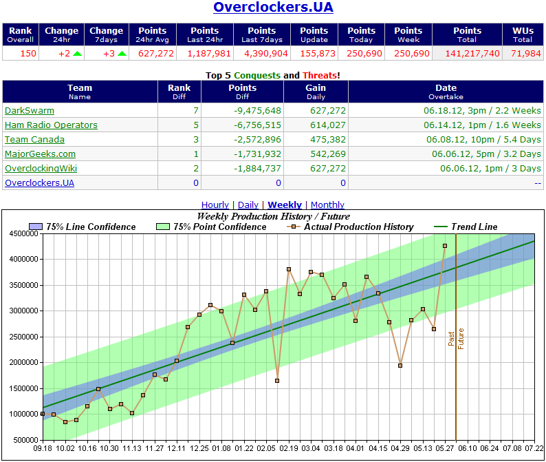 Несмотря на небольшое количество активных участников, выступающих под именем Overclockers.UA, вчера вечером наша команда уверенно вошла в топ-150 коллективов F@H среди более чем 210 тыс. во всем мире. Очередные 50 ступеней после топ-200 дались команде куда более сложно, чем предыдущие, потребовав намного больше усилий и почти 5 месяцев терпения.