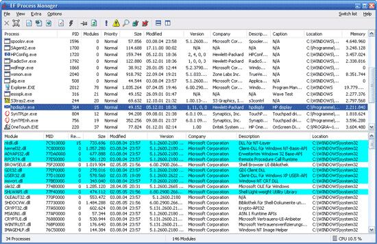EF Process Manager 4.30 - программы для отображения подробной информации о запущенных процессах. С ее помощью можно увидеть все модули, которые загружены, а также только те, которые используются избранными процессами. Также с легкостью можно завершить любой процесс. EF Process Manager отображает количества выделенной под каждый процесс памяти и загрузку процессора, которую создает каждый процесс. Кроме этого, можно экспортировать полученную информацию в Excel для дальнейшего изучения.