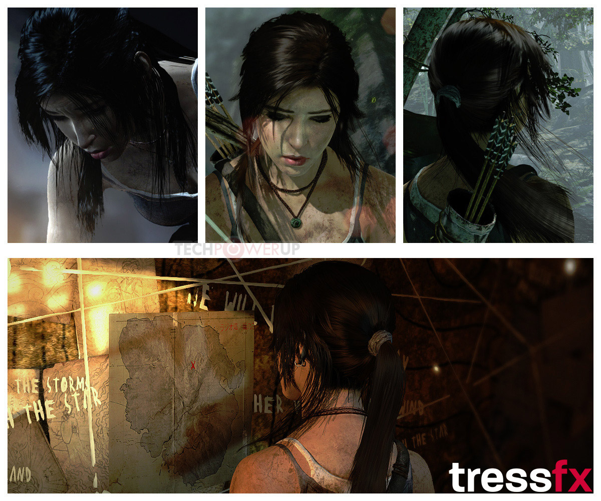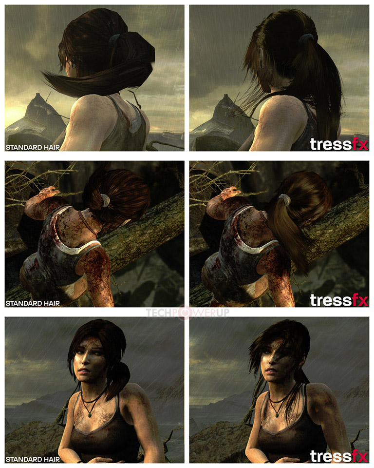AMD разработала новую графическую технологию TressFX, позволяющую создавать реалистичный рендеринг и физику волос. Впервые она будет применена в готовящейся к релизу игре Tomb Raider (2013), которая увидит свет 5 марта. TressFX помогает гораздо точнее прорисовывать волосы Лары Крофт, создавая более тонкие отдельные пряди волос, чем при традиционном методе с наложением текстур на большие полигоны, что выглядит неестественно. Ниже приведены скриншоты для сравнения картинки с использованием новой технологии и без нее:
