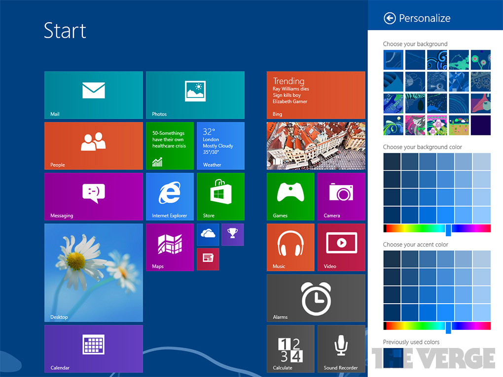 Судя по опубликованным скриншотам, изменения носят, преимущественно, «косметический» характер и призваны повысить удобство работы с интерфейсом Modern (он же Metro). Так, расширены настройки плиток и рабочего стола в целом, усовершенствована навигация (нет необходимости часто обращаться к панели управления), упрощен алгоритм снятия скриншотов, добавлены настройки уведомлений. Кроме того, в состав Windows Blue включен браузер Internet Explorer 11.