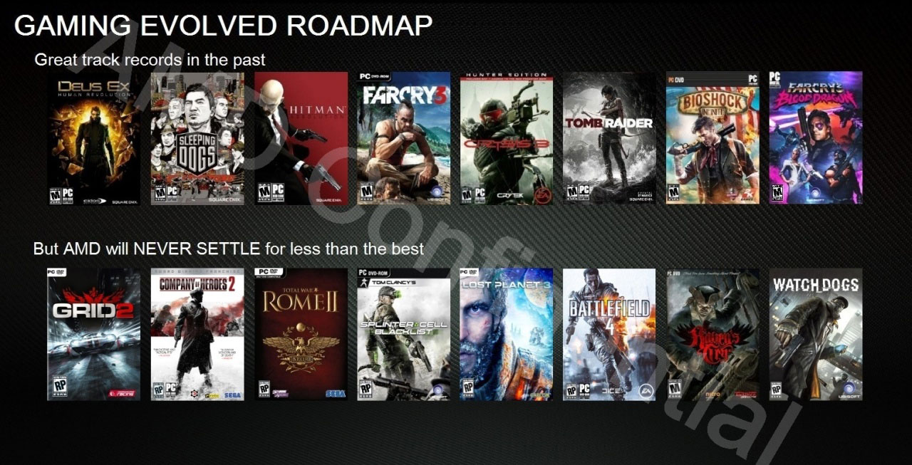 В списке присутствует немало потенциальных хитов, среди которых особняком стоит Battlefield 4. Остальные игры также должны заинтересовать покупателей карт Radeon HD 7000 — автосимулятор Grid 2 (выход ожидается 28—31 мая), стратегические игры Company of Heroes 2 (25 июня) и Total War: Rome II (осень-зима), экшен Splinter Cell: Blacklist (20—23 августа), шутер от третьего лица Lost Planet 3 (27—30 августа), экшены Raven's Cry (24 октября) и Watch Dogs (четвертый квартал). Анонсы новых предложений Never Settle, скорее всего, пройдут поэтапно.