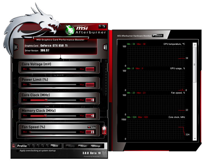 Популярная утилита для разгона и отслеживания рабочих параметров видеокарт MSI Afterburner доступна в новой версии 3.0.0 beta 14. Программа поддерживает свежие модели графических ускорителей (GeForce GTX Titan, GTX 780, GTX 770, GTX 760) и предлагается со стандартной обложкой и обложкой Dragoon Army.