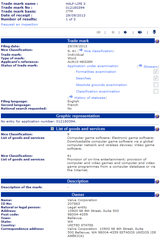 В конце прошлой недели корпорация Valve зарегистрировала на территории Евросоюза торговую марку Half-Life 3. Соответствующая запись находится в базе данных CTM-Online Европейского ведомства по гармонизации на внутреннем рынке (OHIM). «Half-Life 3» зарегистрировано как возможное название игрового ПО, распространяемого разными способами — на физических носителях информации, через проводные и беспроводные сети.