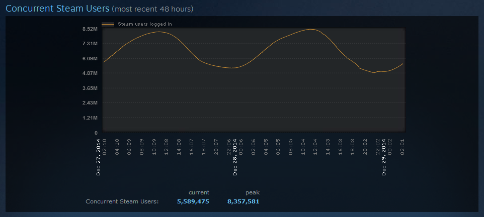 Новогодние распродажи и акции Steam ощутимо расширили и без того немалую аудиторию сервиса. Вчера вечером было зарегистрировано очередное пиковое значение находящихся в системе пользователей — 8 млн 357 тыс.