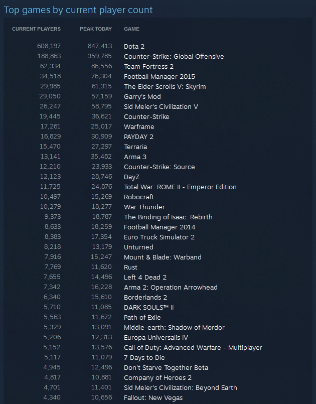 Больше всего геймеров традиционно играли в Dota 2 (около 850 тыс.) и Counter-Strike: Global Offensive (около 360 тыс.). В топ-10 также вошли Team Fortress 2, Football Manager 2015, The Elder Scrolls V: Skyrim, Sid Meier's Civilization V, Garry's Mod, Counter-Strike, Arma 3 и Payday 2.