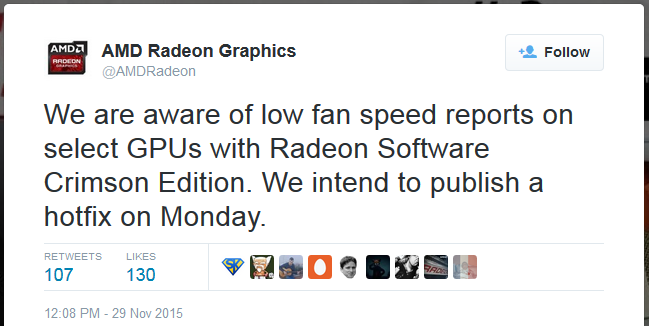 AMD: «Мы в курсе сообщений о понижении скорости вентилятора на некоторых GPU с Radeon Software Crimson Edition и намерены опубликовать hotfix в понедельник»