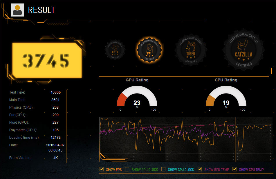 В отличие от устаревшего модуля определения конфигурации системы в Catzilla, 4K-версия корректно распознает современные видеокарты, в том числе готовящийся Radeon Pro Duo. Система оценки производительности упрощена, и наряду с количеством набранных очков пользователю демонстрируется график fps.