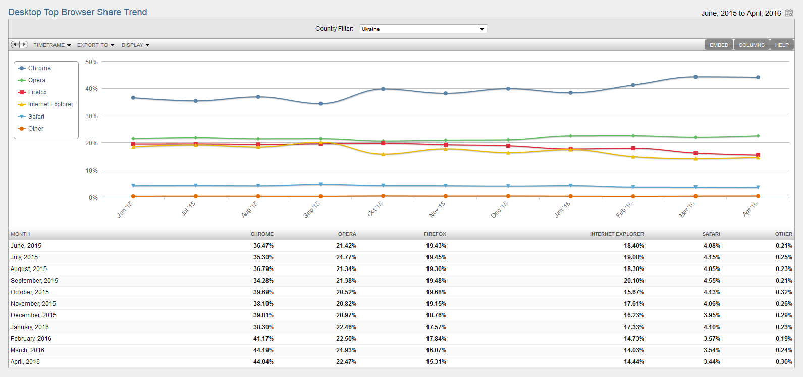 Многие украинские интернет-пользователи давно сделали выбор в пользу детища Google. В марте и апреле доля Chrome составляла 44%. В предыдущем месяце наиболее активно росла аудитория Opera (c 21,9% до 22,5%), а Internet Explorer вплотную приблизился к Mozilla Firefox.