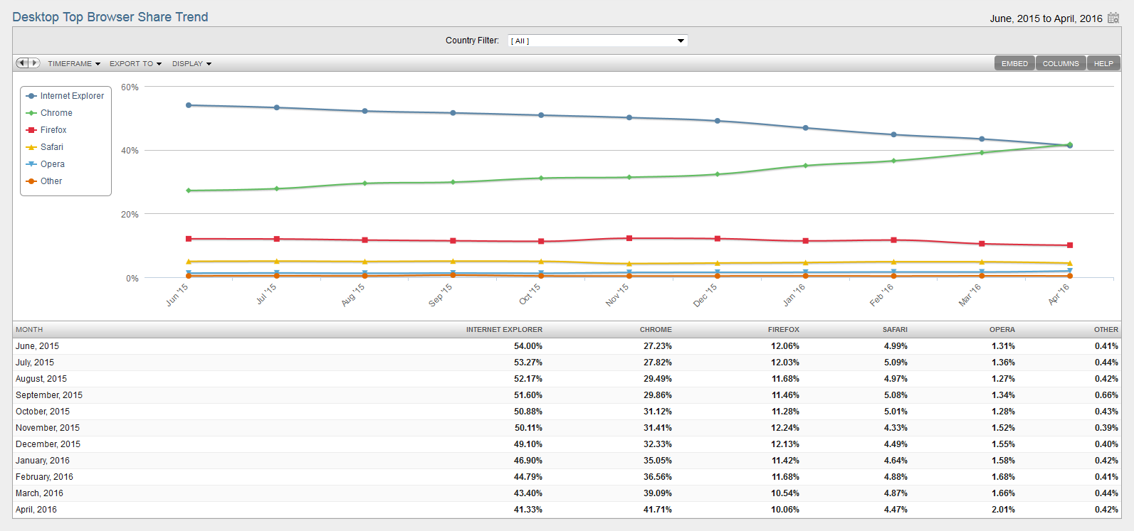 Согласно статистике аналитической компании Net Applications, владеющей ресурсом NetMarketShare, Google Chrome стал самым популярным веб-браузером в мире, опередив Internet Explorer от Microsoft. IE впервые уступил первую строчку, впрочем, он уже давно не рассматривается в качестве основного подавляющим большинством «продвинутых» пользователей.