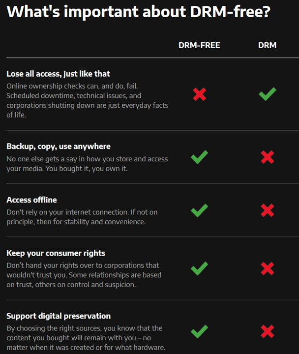 С момента своего запуска в 2008 году сервис GOG.com предлагает покупателям игры без DRM-защиты. Мы твердо верим, что, если вы купили игру, она должна быть вашей навсегда, и вы можете играть в нее, где и как вам удобно, а не как хотят другие. За прошедшие десять лет утекло много воды, но многие люди так и не понимают в чем проблема DRM. Вы не никогда не знаете, за что можете быть заблокированы от доступа к купленным товарам и услугам. Причем, это качается не только игр, но и ваших книг, фильмов, музыки и приложений.