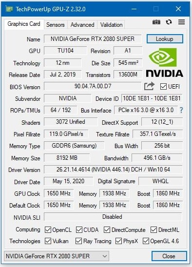 В числе прочих нововведений GPU-Z v2.32.0 значится исправление показаний Hardware Accelerated GPU Scheduling с «Unknown (8)» на «Disabled, not supported», а также поддержка видеоадаптеров AMD Radeon Pro W5700X, WX 4170, Nvidia GeForce GTX 1650 Ti Mobile (TU116-A) и Tesla V100S-PCIE-32 GB.