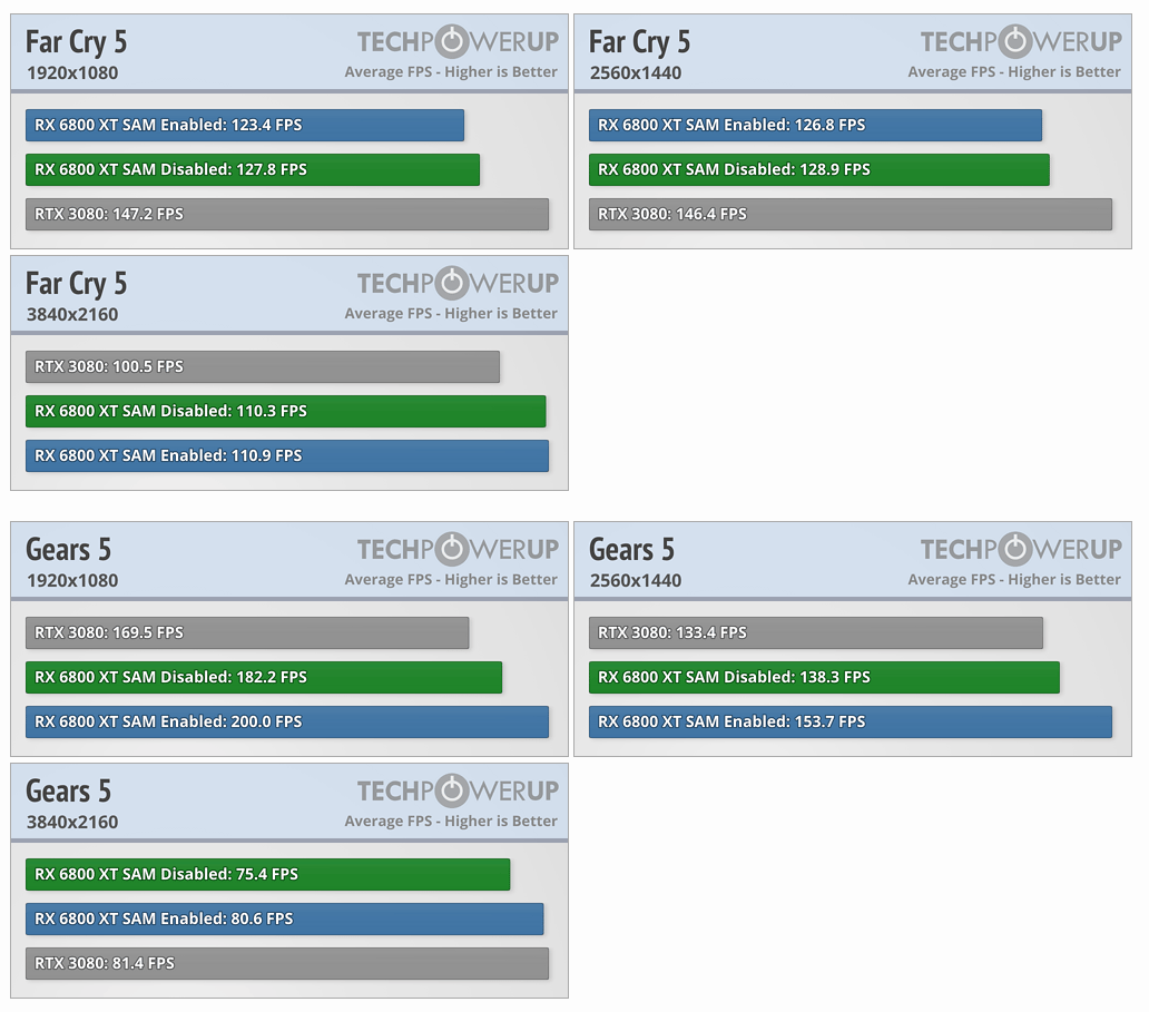 Считается, что Resizable BAR способна увеличивать производительность в играх за счет прямого доступа CPU к памяти видеокарты. Маркетинговые материалы говорили о выигрыше до 5–10%, однако независимые тесты этого же портала TechPowerUp на примере Radeon RX 6800 XT показывают пользу от Smart Access Memory лишь в нескольких играх. В большинстве случаев рост производительности отсутствует или выражен на уровне 1–2%.