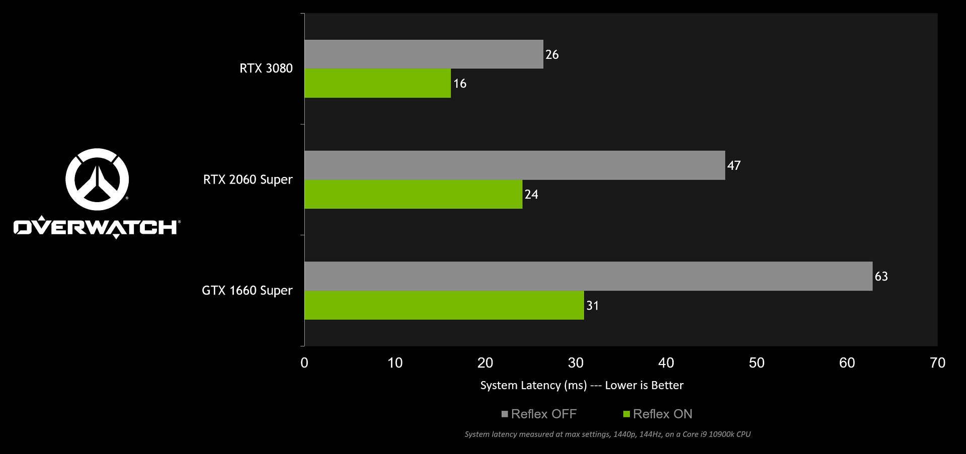 Как показывают собственные тесты «зелёных», активация Nvidia Reflex позволяет снизить задержки системы в Overwatch практически вдвое.