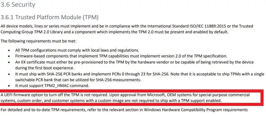 Для установки Windows 11 в системе без включенного TPM потребуется специальное разрешение Microsoft. Компания позволяет «OEM-производителям специальных коммерческих систем, заказных систем и клиентских систем с пользовательским образом» поставлять системы без включенной поддержки TPM.