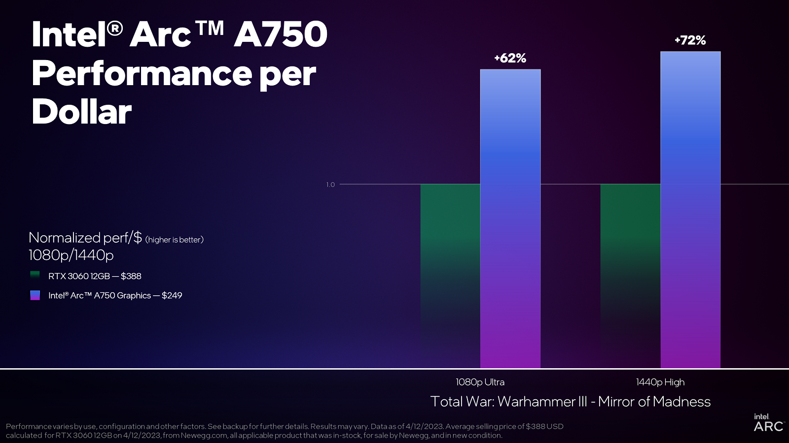 Intel также не упускает возможности напомнить о высокой производительности на доллар. В случае модели Arc A750, если верить чипмейкеру, превосходство над GeForce RTX 3060 12GB достигает 72% в Total War Warhammer III.