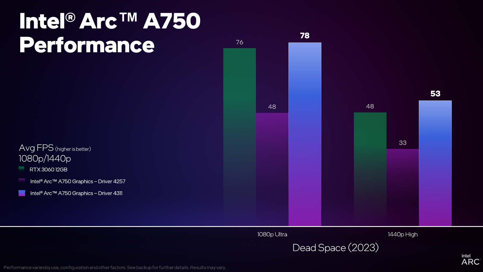 Самый значительный прирост быстродействия геймеры увидят в римейке Dead Space. Intel заявляет о повышении производительности до 63% в разрешении 1440p с высокими настройками качества графики. Вероятно, это связано с тем, что предыдущий выпуск просто не был оптимизирован для Dead Space. В других играх прирост не такой ощутимый. С точными показателями можно ознакомиться ниже.