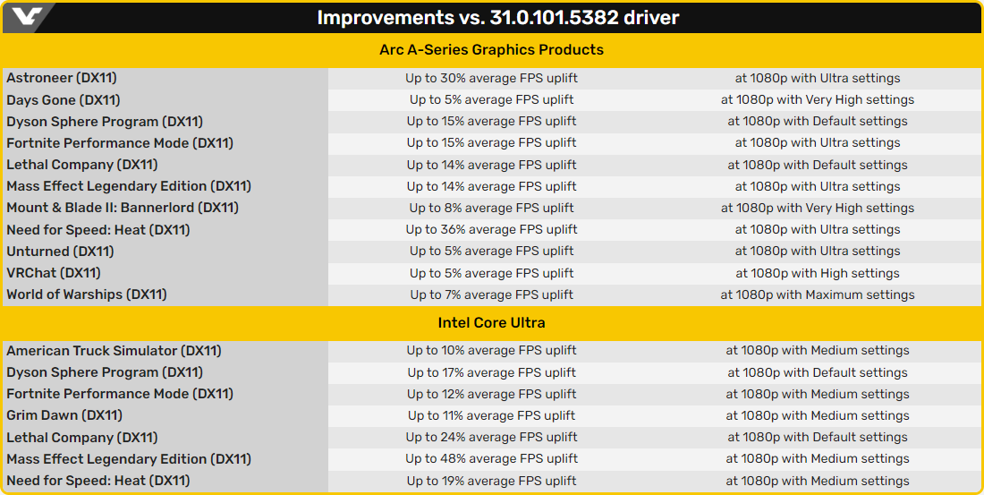 Прирост быстродействия будет зависеть от конкретной игры и находится в диапазоне от 5% до 48%. К примеру, производительность видеоадаптеров Arc A-серии в Days Gone вырастет всего на 5%, тогда как в Mass Effect Legendary Edition владельцы ноутбуков с процессорами Core Ultra (Meteor Lake) могут рассчитывать почти на полуторакратный прирост частоты кадров. Более подробная информация собрана в таблице.
