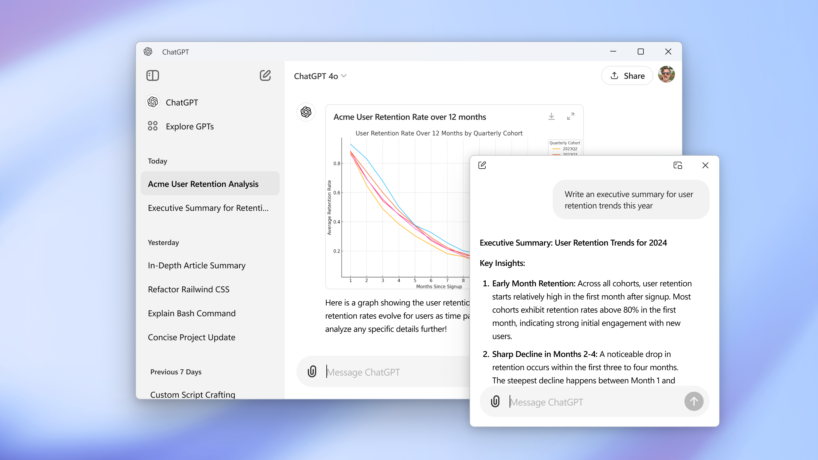 Компания OpenAI запустила специальное приложение для своего чат-бота ChatGPT под операционную систему Windows, но пока с ограниченным доступом. Ранее в этом году вышло приложение для платформы Mac. Теперь вам не нужно будет общаться с интеллектуальным чат-ботом через веб-форму или мобильное приложение, все функции будут доступны через программу в среде Windows.