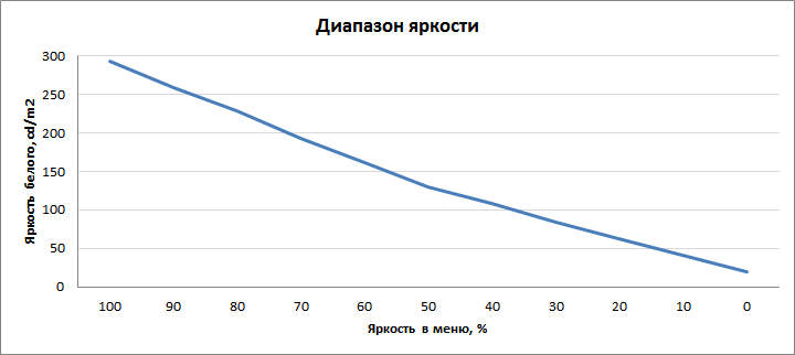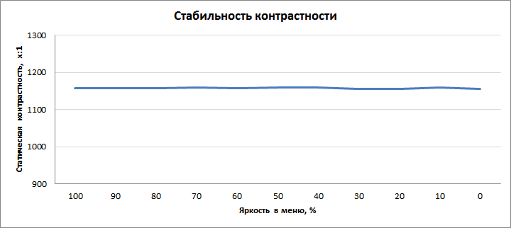 Диапазон регулировки яркости подсветки доступен в пределах от 19 до 293 кд/м². Коэффициент контрастности отличается высокой стабильностью во всем диапазоне яркости и в среднем составил 1157:1.